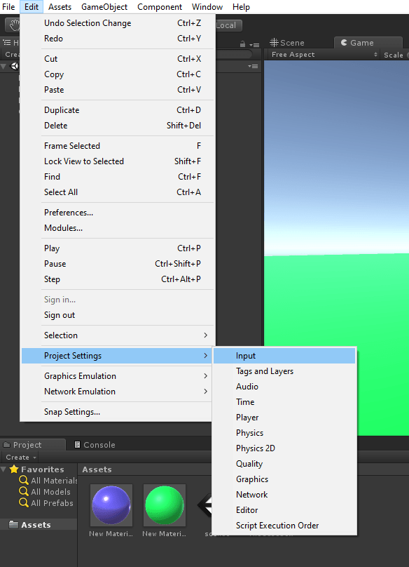 De ce coté la c’était un poil plus complexe, mais voici la solutions. Cliquez sur « Edit -> Projet Setings – > Input » et vous verrez apparaitre sur la droite un panel dans lequel nous définirons nos JoySticks et leurs paramètres.