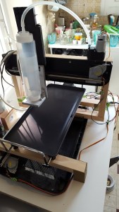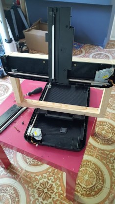 Les vieux scanners sont parfaits pour ce genre de bricole car ils embarquent des moteurs pas à pas et sont montés avec des axes rectifiés. Les plus récent sont tout en plastique et donc ne peuvent pas faire l’affaire. Pour l’axe Y, j’ai ouvert le premier scanner et je l’ai posé tel quel. J’ai fixé un joli cadre fait avec les tasseaux de bois sur le support de la lampe du scanner. Puis j’ai fixé en haut de celui-ci l’autre bas de scanner découpé sur le sens de la longueur. A ce niveau là, les deux axes sont en place, il ne reste plus qu’à placer le système de dépôt de pâte.