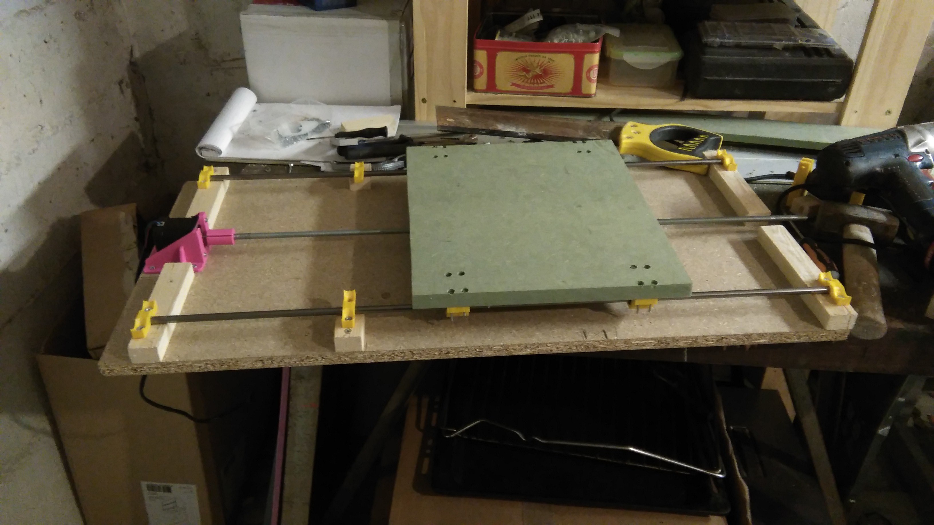 Les vieux scanners sont parfaits pour ce genre de bricole car ils embarquent des moteurs pas à pas et sont montés avec des axes rectifiés. Les plus récent sont tout en plastique et donc ne peuvent pas faire l’affaire. Pour l’axe Y, j’ai ouvert le premier scanner et je l’ai posé tel quel. J’ai fixé un joli cadre fait avec les tasseaux de bois sur le support de la lampe du scanner. Puis j’ai fixé en haut de celui-ci l’autre bas de scanner découpé sur le sens de la longueur. A ce niveau là, les deux axes sont en place, il ne reste plus qu’à placer le système de dépôt de pâte.