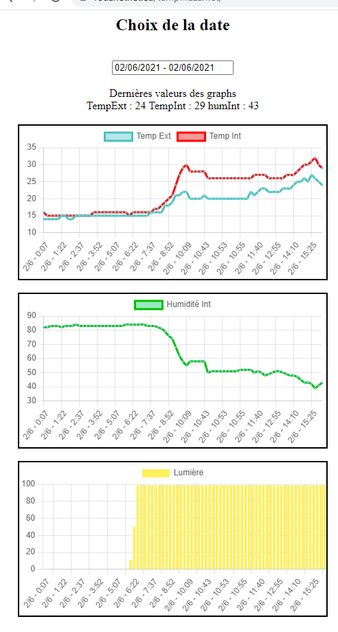 Le modem envoie des données sur le réseau Sigfox (un réseau bas débit disponible partout en France et dans beaucoup d’autres pays) qui les renvoie via un « callback » sur un serveur maison où je les stocke dans une base de données. J’ai ensuite fait une petite interface en utilisant chartJS afin de les visualiser.